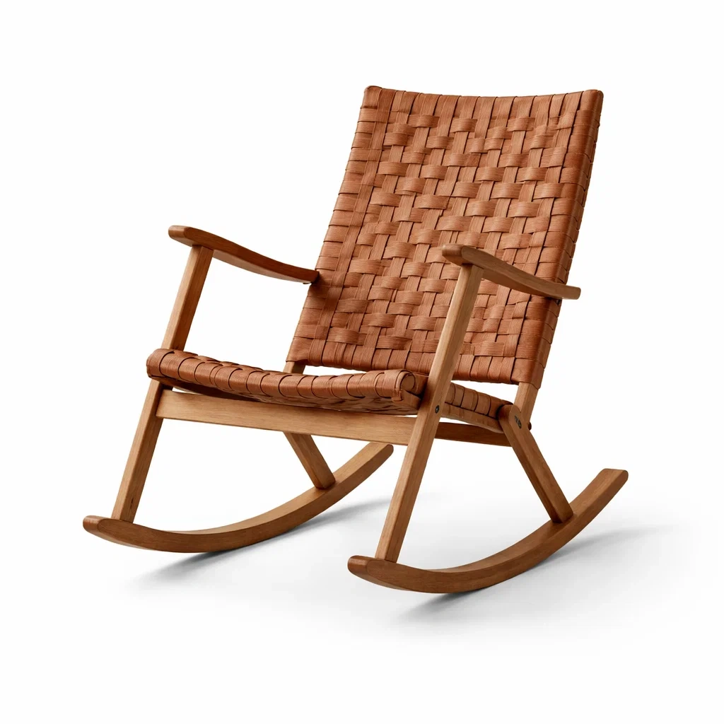 Fauteuil à bascule en bois et cuir tressé brun