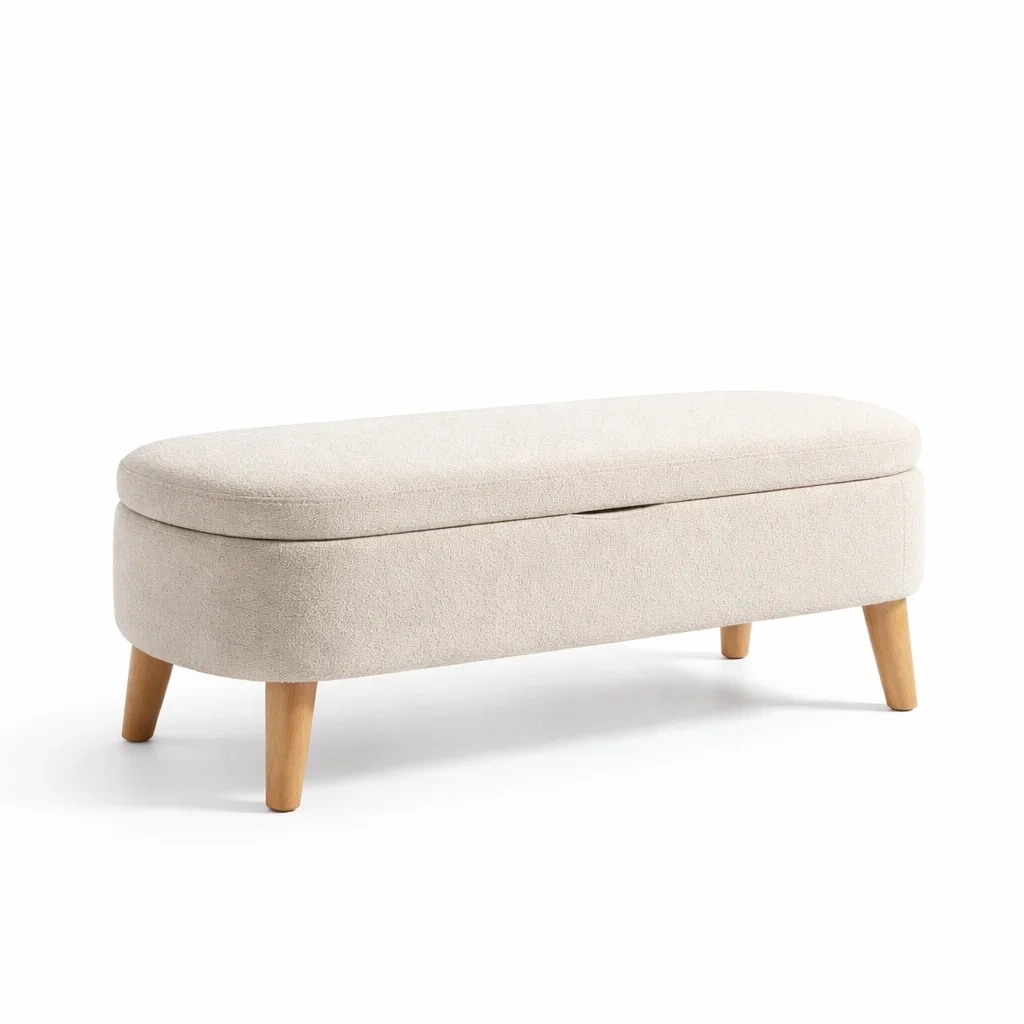 Banc de rangement en tissu polyester beige avec pieds en bois