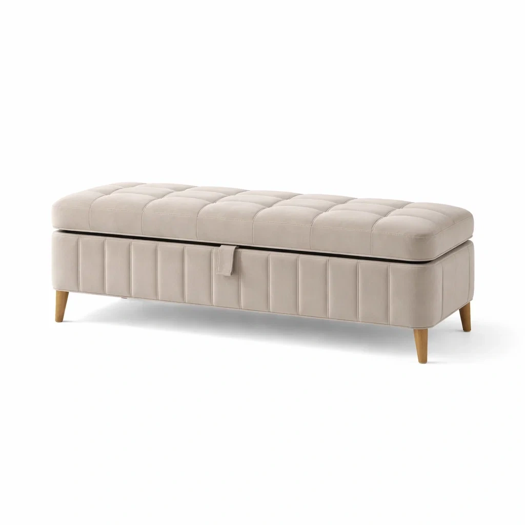 Structure en velours polyester avec pieds en bois massif. Rembourrage en mousse polyuréthane. Dimensions : 140 cm de longueur, 40 cm de largeur, 45 cm de hauteur. Couleur Beige. Le banc offre un espace de rangement intégré. Nettoyage facile avec un chiffon humide.