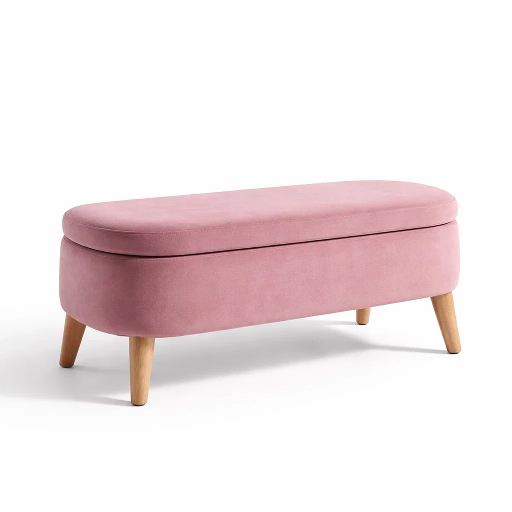 Banc de rangement en velours rose avec pieds en bois