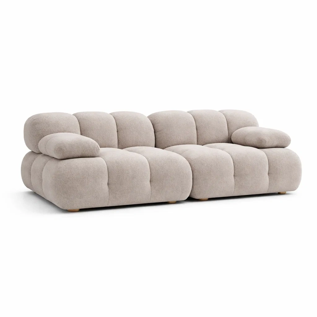 Ce canapé modulable est fabriqué en tissu polyester doux avec un cadre en bois massif et des pieds en bois. Dimensions : longueur 320 cm, profondeur 150 cm, hauteur 70 cm et hauteur d'assise 40 cm. La couleur principale est le Beige. Le rembourrage est en mousse polyuréthane de haute densité. L'entretien se fait par épongement des taches avec un chiffon humide et l'utilisation d'un aspirateur pour enlever la poussière.